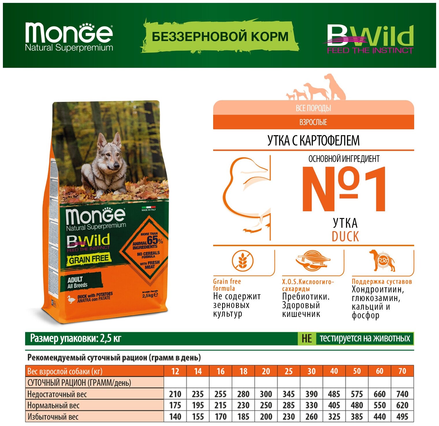 Лучшие цены. Monge (Монж) Dog BWild GRAIN FREE (холистик) беззерновой сухой корм из мяса утки с картофелем для взрослых собак всех пород 12 кг. Появление линии кормов BWild GRAIN FREE было обусловлено идеей создания для собак рациона питания, аналогичного тому, которое получали их неодомашненные предки, получавшие высокобелковую пищу и не употреблявшие зерновые продукты. Рацион подходит питомцам склонным к аллергической реакции на глютен, а также для молодых животных, ведущих Monge (Монж) Dog BWild GRAIN FREE (холистик). Магазины в вашем городе.