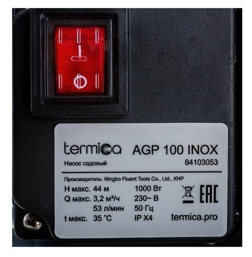 Лучшие цены. Артикул № 641674 Поверхностный насос Termica AGP 100 Inox предназначен для перекачивания чистой воды, для водоснабжения приусадебных участков, садов, перекачивания воды из баков, систем полива и орошения. Поверхностный насос Termica AGP 100 Inox имеет следующие особенности: Имеет монофазный электродвигатель; Снабжен тепловой защитой, имеет встроенный пусковой конденсатор; Не должен использоваться для перекачивания огнеопасных жидкостей, топлива, масел, а также воды, содержащей механические примеси в виде. Магазины в вашем городе.