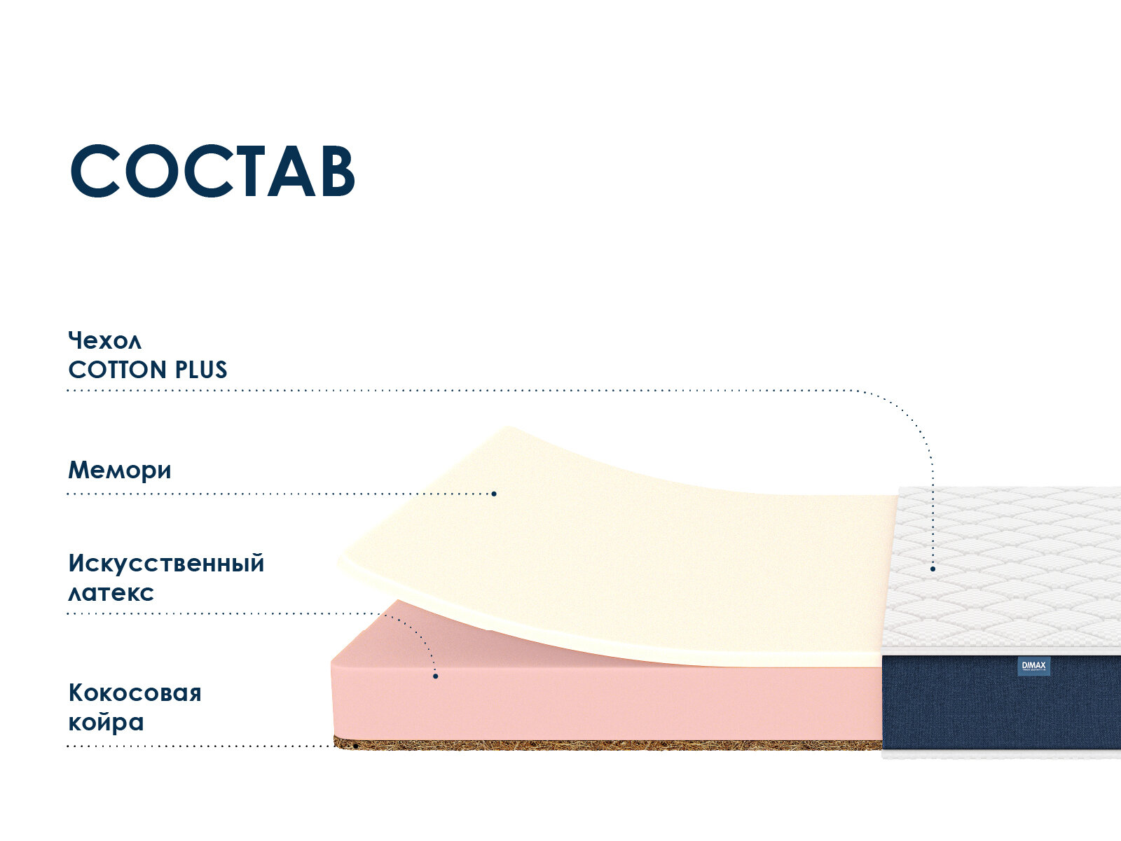 Матрас 105х186 Dimax PracticМемо 16, беспружинный, двусторонний с разной жесткостью, полумягкий, жесткий, memory foam пенополиуретан кокосовое волокно, односпальный 186х105 21 835 ₽ Подробнее