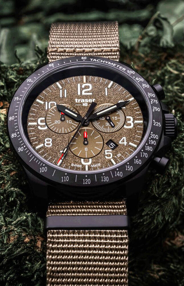 Лучшие цены. Пол: мужские. Тип часов: спорт. Механизм: кварцевые. Форма корпуса: круглые. Материал корпуса: нержавеющая сталь. Цвет корпуса: черный. Покрытие корпуса: полное PVD черного цвета. Водозащита: 100м (10 АТМ). Стекло: сапфировое. Циферблат: со стрелками. Цвет циферблата: коричневый. Цифры/метки: арабские цифры; штрихи. Календарь: дата. Подсветка: тритиевая подсветка/тригалайт. Браслет/ремешок: матерчатый/текстильный ремешок. Цвет браслета/ремешка: светло-коричневый. Свойства/Функции: хронограф/секундомер. Магазины в вашем городе.