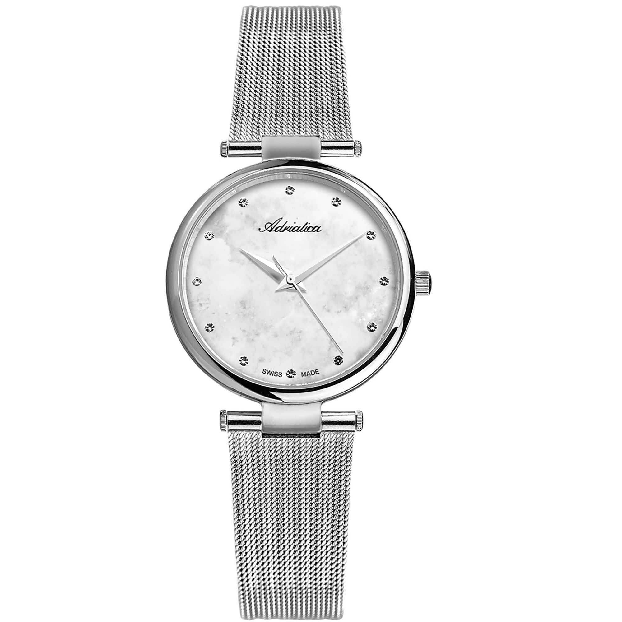 Лучшие цены. Женские кварцевые часы. Круглый корпус выполнен из нержавеющей стали. Диаметр корпуса составляет 34 мм. Браслет из нержавеющей стали, техника миланского плетения, застежка-слайдер. Циферблат декорирован фианитами. Минеральное стекло, устойчивое к мелким механическим повреждениям. Водозащита WR30 (брызги, дождь). Магазины в вашем городе.