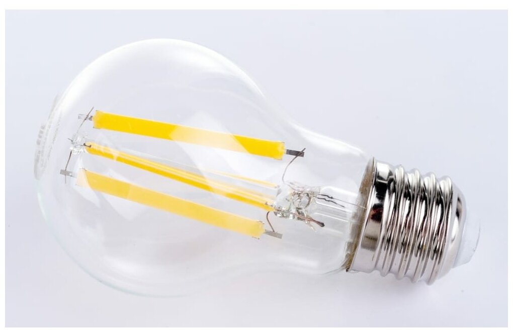 Лучшие цены. Характеристики Тип: филаментная Цоколь: E27 Цветопередача, Ra: 82 Диаметр, мм: 60 Требует пуско-регулирующей аппаратуры: нет Длина, мм: 105 Вид: CL/прозрачная Тип колбы: A Цветовая температура, К: 3000 Световой поток, Лм: 1200 Срок службы, ч: 30000 Мощность (Вт): 13 Напряжение, В: 220 Угол светового пучка, град: 330 Эквивалент лампы накаливания, Вт: 110 Цветность: теплый белый (менее 3300 К). Магазины в вашем городе.