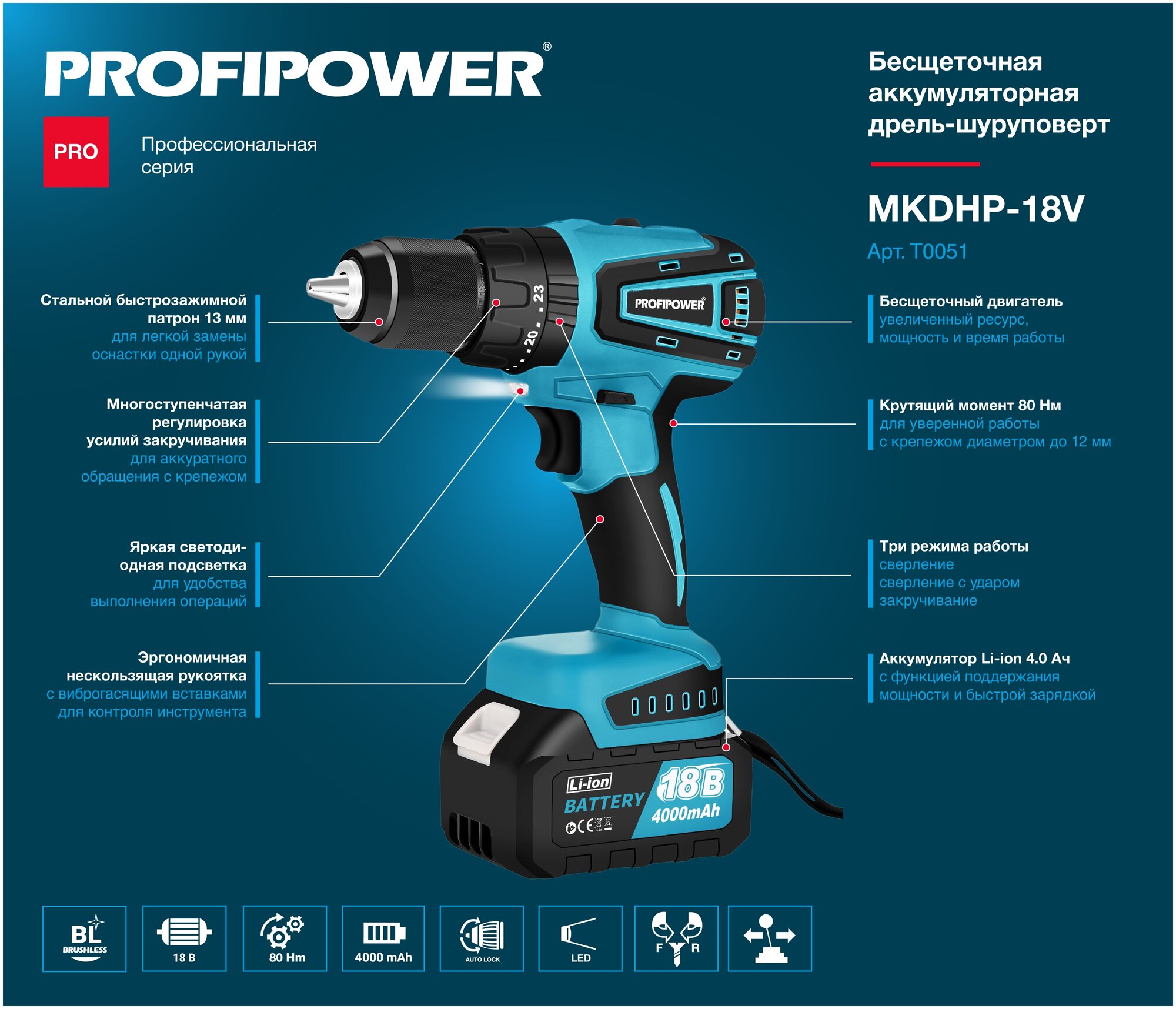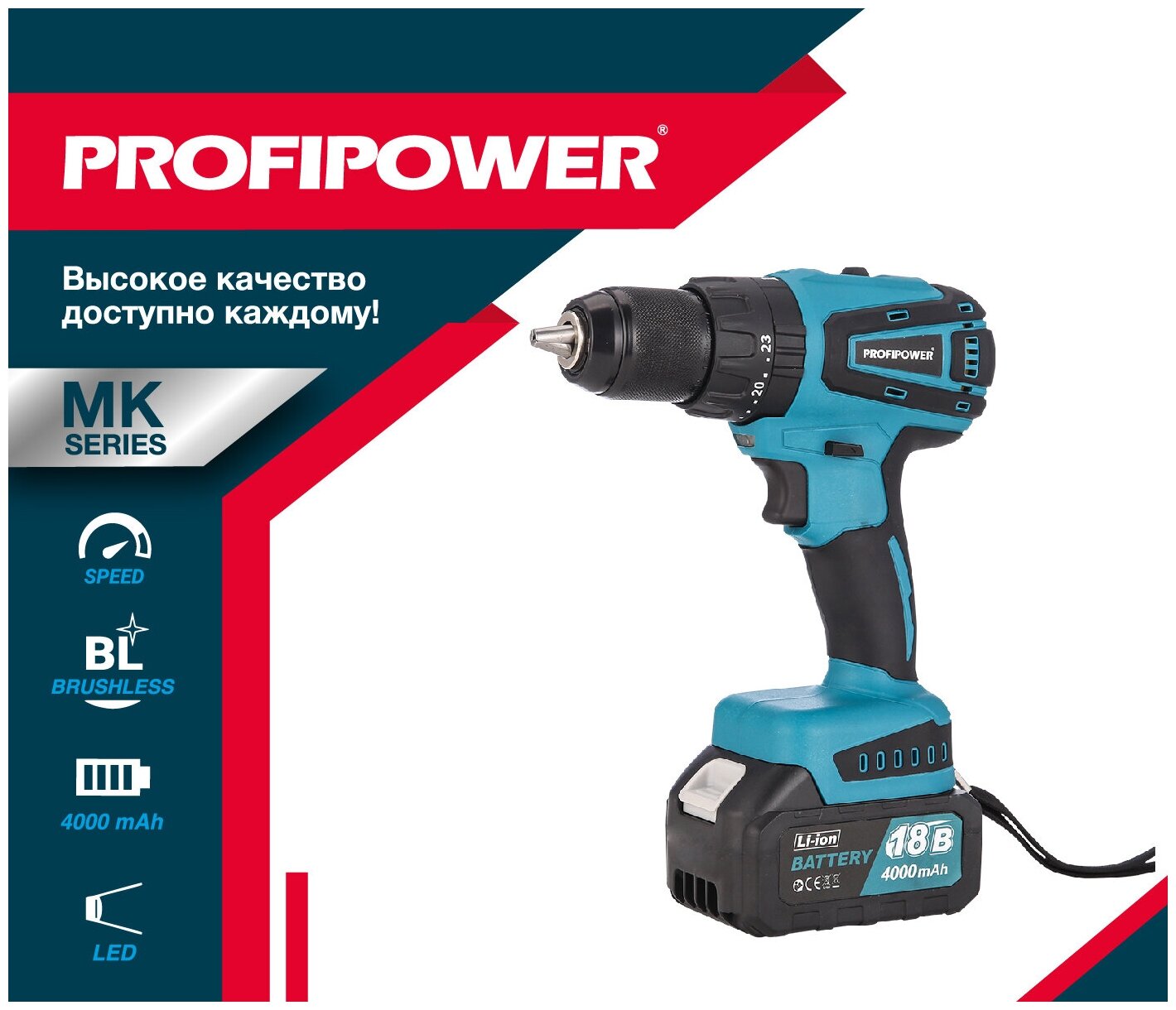 Дрели и шуруповерты Дрель-шуруповерт бесщеточная аккумуляторная ударная Profipower 18В, MKDHP-18V