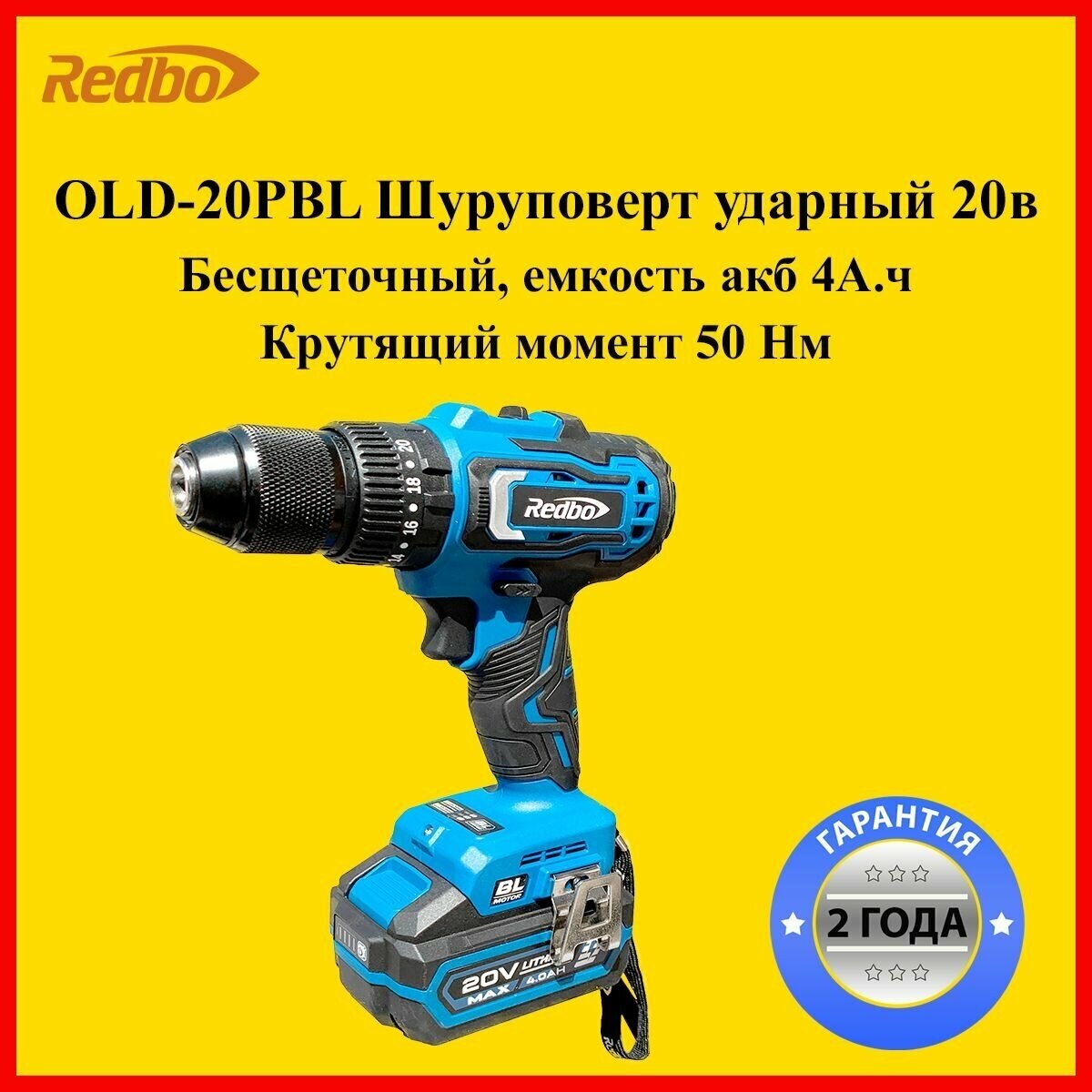 Лучшие цены. Дрель-шуруповерт аккумуляторная ударная Redbo OLD-20PBL, предназначена для закручивания, отворачивания винтов и шурупов, сверления отверстий в различных конструкционных материалах (в том числе металле, дереве, пластмассе и т. д.). Особенности: - ударный; - бесщёточный - защита двигателя от перегрузок; - 2-х скоростной планетарный механизм; - улучшенный быстрозажимной патрон; - светодиодная подсветка рабочей зоны; - реверс; - регулировка частоты вращения; - регулятор оборотов с плавным пуском. Магазины в вашем городе.