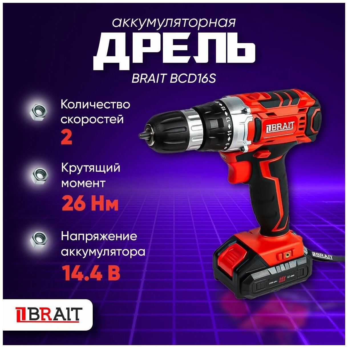 Дрель аккумуляторная BRAIT BCD16S (14,4В Li-ion; 2 акк.1,5Ач, 2 скор., 26Нм, индикатор заряда)