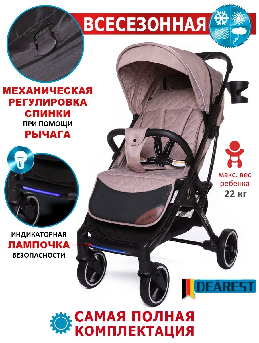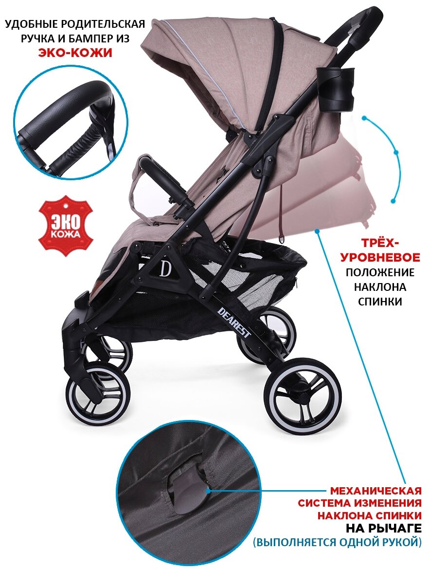 Коляска прогулочная Dearest 819 PLUS модель 2023, с механической спинкой, большим капюшоном, накидкой для ног, полная комплектация, белая рама (шампанское)