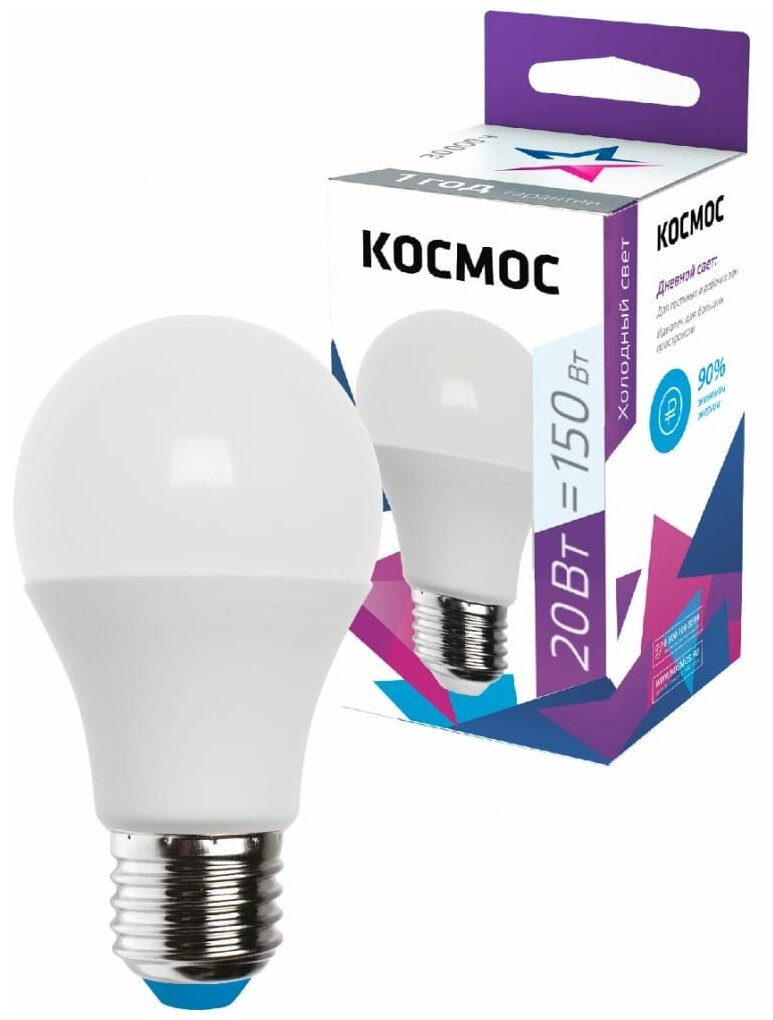 Лампочка светодиодная А60 Космос, 20Вт 220В, цоколь Е27, белый свет 6500К, 1 шт.