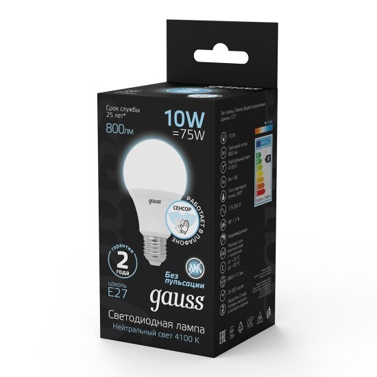 Лампочки Светодиодная лампа Gauss A60 10W 800lm 4100К E27 Сенсор LED 1/10/100