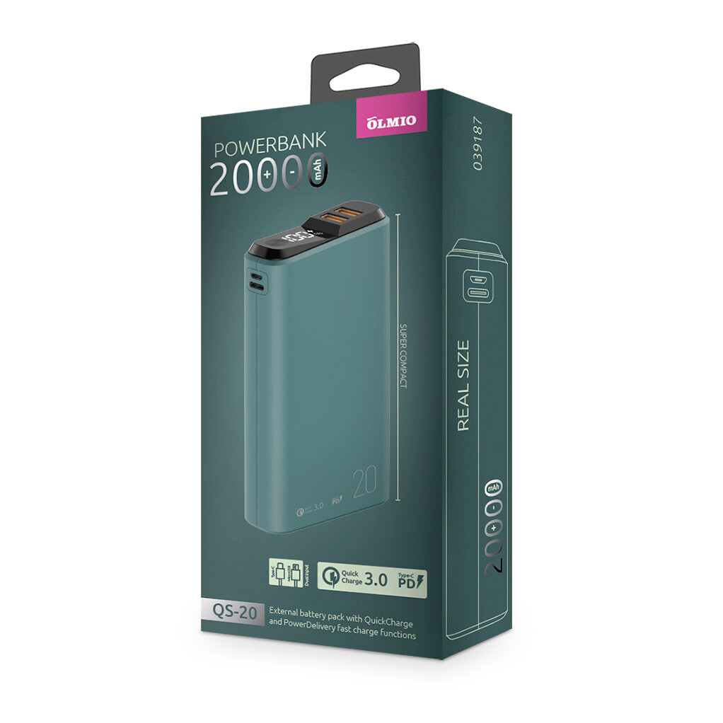 Внешний аккумулятор OLMIO QS-20, 20000mAh, 18W QuickCharge3.0/PowerDelivery, LCD, Зеленый