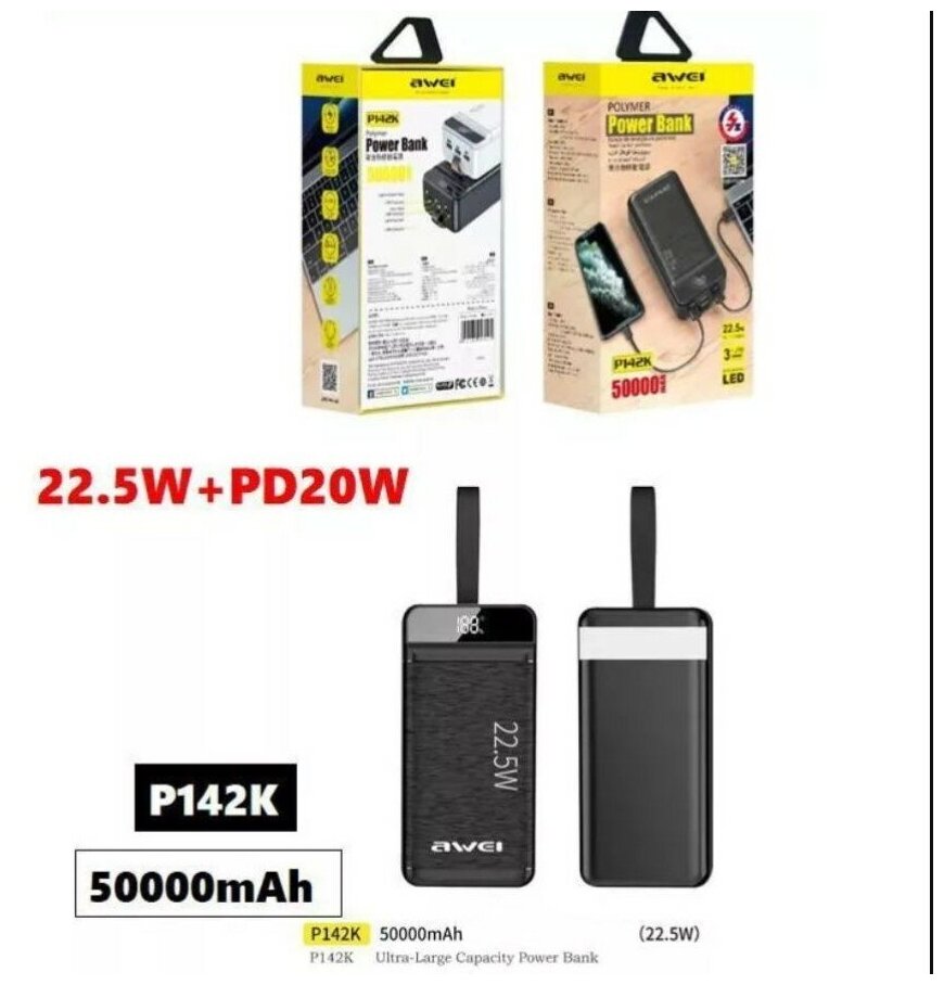 Powerbank Внешний аккумулятор Awei P142K Polymer Power Bank с цифровым дисплеем, 50000 мАч, 22,5 Вт, 3 x USB - Черный