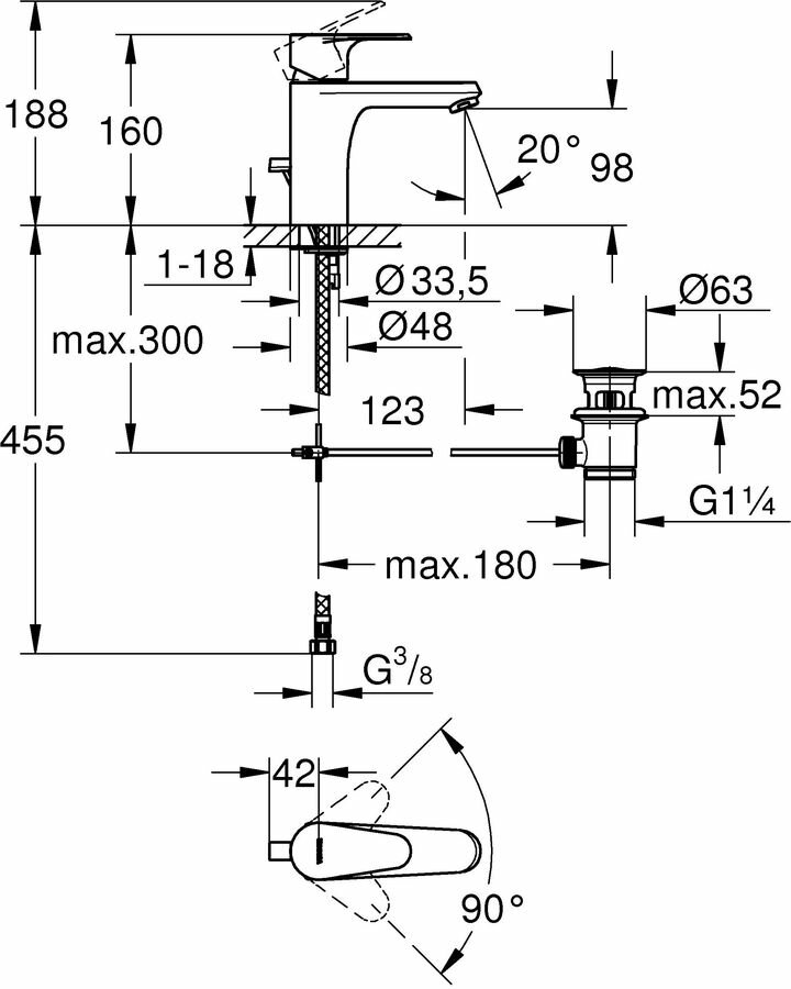 | Глубина струи | 411 мм / излив — 322 мм / |