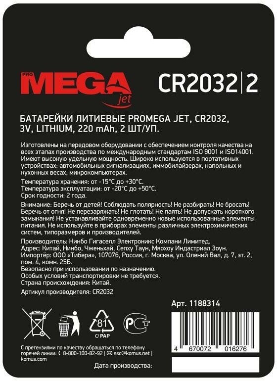 Лучшие цены. Батарейки Promega MJCR2032-C2 изготовлены по новой формуле для более надежной и продолжительной работы устройств с высоким потреблением энергии. В упаковке 2 штуки. Лучший способ утилизировать отработавшие батарейки — приносить их в контейнеры для дальнейшей переработки. Такие контейнеры сейчас устанавливаются во многих супермаркетах, торговых центрах и магазинах бытовой техники. Утилизация батареек должна происходить согласно санитарным нормам, то есть в специализированный контейнер. Магазины в вашем городе.
