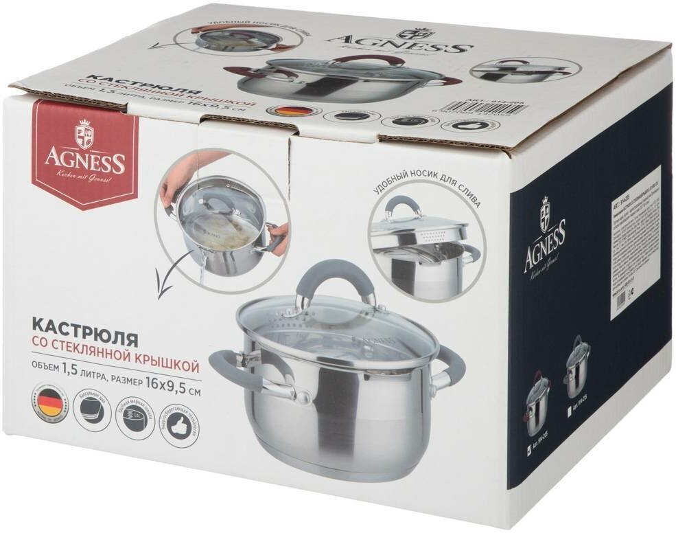Лучшие цены. Кастрюля profi home со стеклянной крышкой, 1,5л 16x9.5 см Agness (914-210) Бренд AGNESS представляет стильные кастрюли серии PROFI HOME. Кастрюли выполнены из нержавеющей стали с высокими антикоррозионными свойствами. Преимущества серии PROFI HOME это: • Практичный дизайн с широким носиком для слива, что очень удобно во время готовки • Энергосберегающее капсульное дно. Такое дно имеет свойства накапливать (аккумулировать). Магазины в вашем городе.