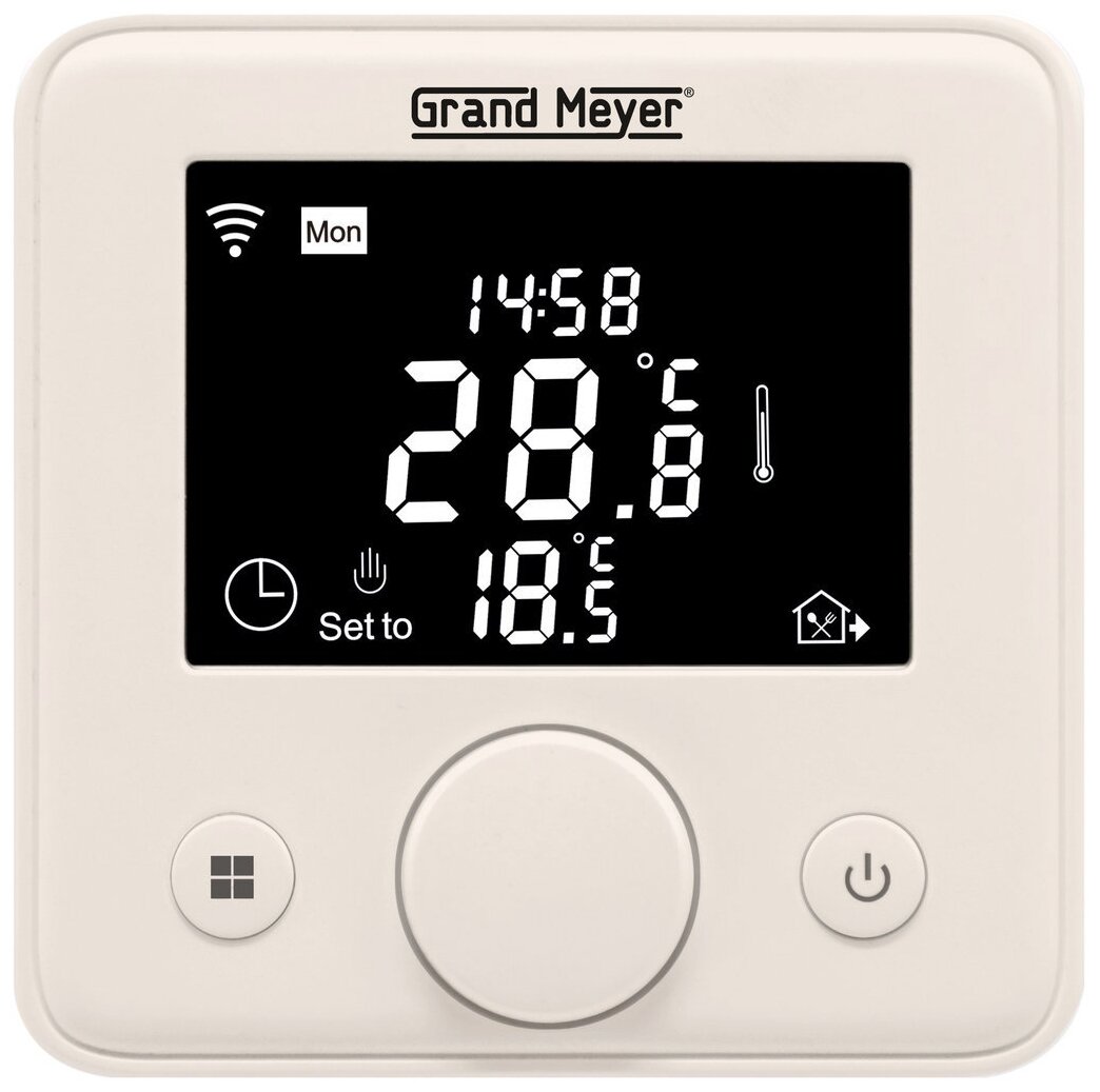 Лучшие цены. Grand Meyer Mondial Series W330, программируемый терморегулятор с функцией удаленного доступа Wi-Fi для управления отоплением электрического типа. Возможность программируемого, а также ручного управления. Возможность установки недельного периода 5+2/6+1/7 дней. Максимальная нагрузка 3600 W. Установка в стандартную монтажную коробку. Память настроек при отключении питания. Огнезащитный пластик. NTC датчик. Диапазон установки: от +5°C до +50°C (заводские). Магазины в вашем городе.