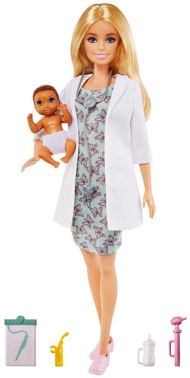 Лучшие цены. Откройте для себя мир веселья и заботы с детским доктором Барби! Когда девочка играет с Барби, она представляет, кем может стать, и если ей нравится заботиться о младенцах, она может стать маленьким врачом! В набор входят кукла-младенец и кукла Барби, одетая в милое платье с рисунком в виде бабочек и белый халат. Шесть аксессуаров из набора, некоторые из которых можно зафиксировать в руке куклы Барби, сделают игру реалистичнее. Детям понравятся придумывать множество увлекательных игровых сюжетов. Магазины в вашем городе.