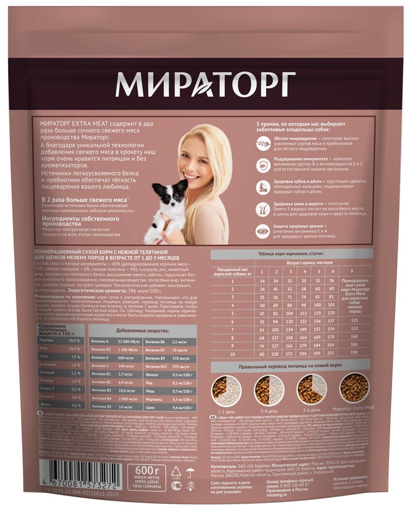 Корм сухой мираторг Extra Meat с нежной телятиной для щенков мелких пород от 1-9мес., 600 г