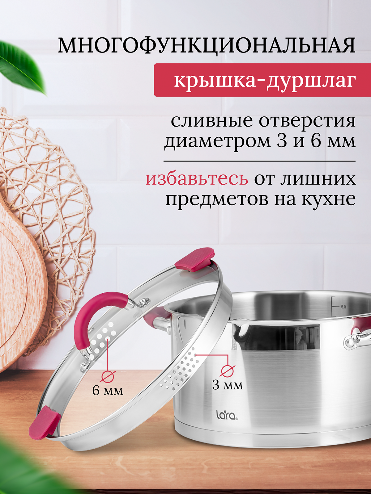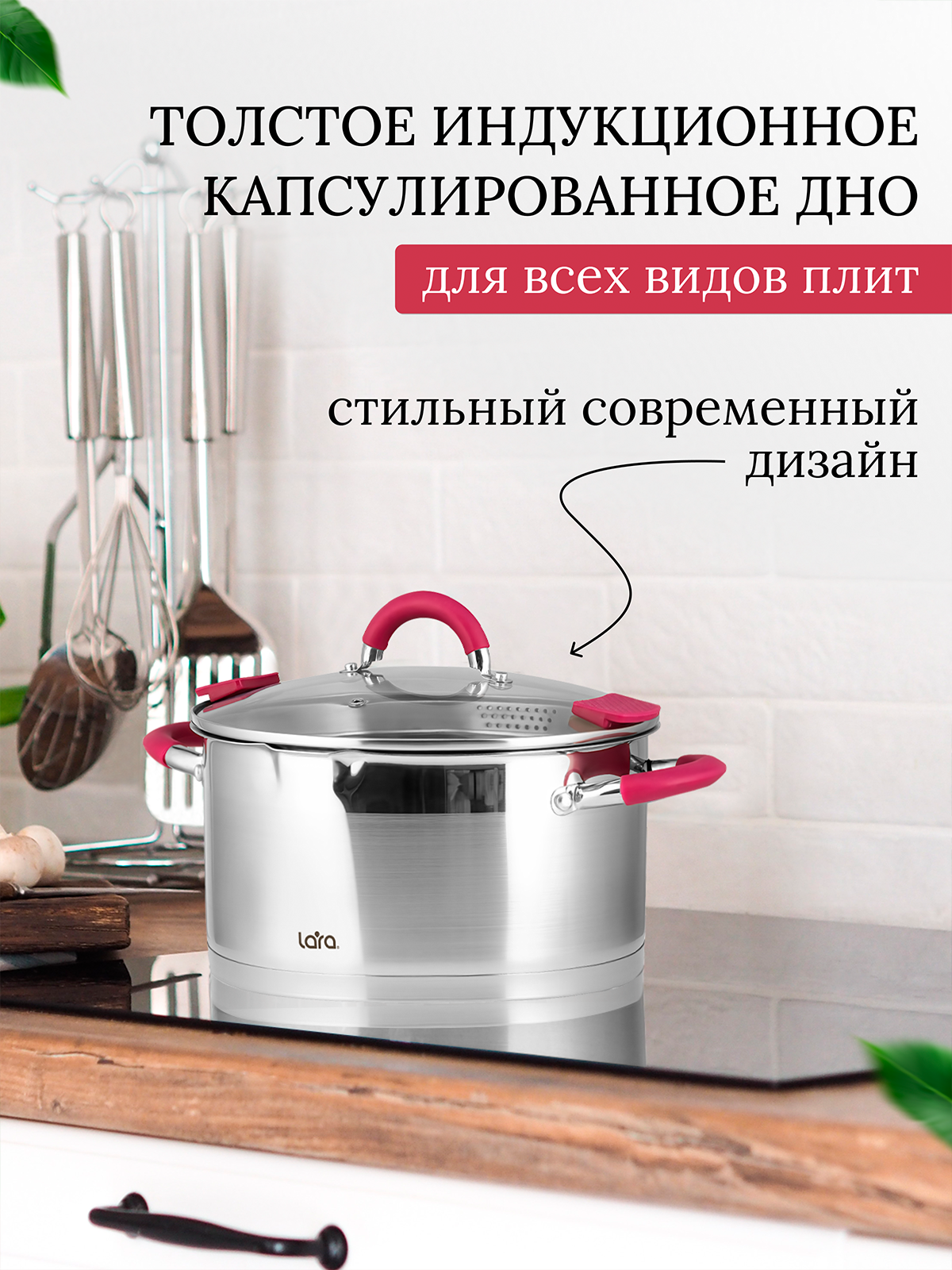 Лучшие цены. Линейка современных кастрюль LARA серии «Viva» украсит интерьер вашей кухни, добавит современного стиля и станет главной помощницей на ней. Оригинальный дизайн прямой формы с комбинированной полировкой и отделкой бордового цвета не оставит равнодушной ни одну хозяйку. Кастрюли выполнены из высококачественной нержавеющей стали AISI201, термостойкого стекла и ненагревающегося силикона на ручках. Магазины в вашем городе.