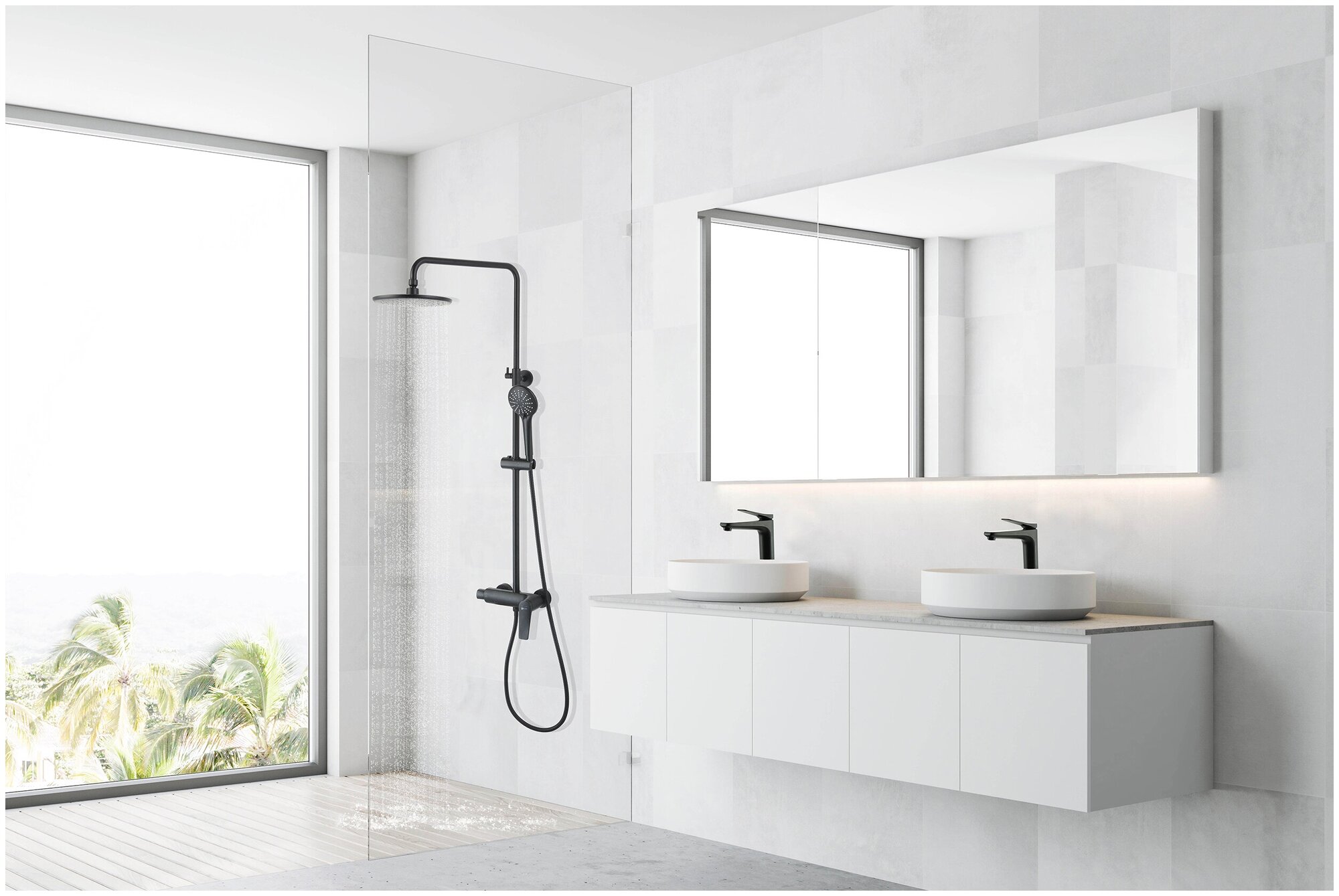 | Комплектация | ручной душ (душевая лейка) / верхний душ (тропический) / смеситель / стойка / штанга / душевой шланг / крепление ручного душа |