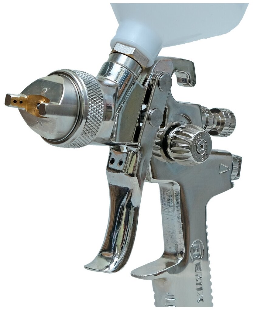 Лучшие цены. Remix АВ-17G профессиональный пневматический окрасочный пистолет системы HVLP с верхним бачком. Серия Heavy Duty. Потребление воздуха 450 л/мин с коэффициентом переноса более 70%. Рабочее давление 3-3,5 Бар. Краскопульт подойдет, как для финишных работ, так и для нанесения грунтов-порозаполнителей. Краскопульт выпускается с соплами: 1,4 мм - универсальны для нанесения базы и лака, масла, олифы; 1,5 мм - густые 2-к лаки и эмали, грунты; 1,7 мм - грунты порозаполнители, защитные покрытия; особенности. Магазины в вашем городе.