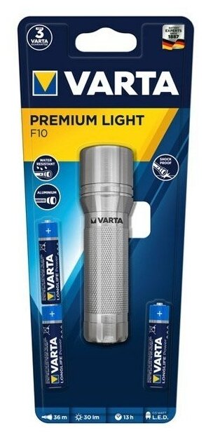 Лучшие цены. Устройство Фонарь VARTA PREMIUM LED LIGHT 3AAA BLILB 4008496677443 Артикул: 17634101421 Varta Высококачественный водонепроницаемый фонарь в алюминиевом корпусе Высококачественный водонепроницаемый (стандарт IPX4) алюминиевый корпус Высокопроизводительный светодиод 0,5 Вт с экономичным потреблением энергии Компактный, элегантный дизайн Длина светового луча: до 36 м Время работы: до 13 ч Общая производительность фонаря: до 30 люмен Источник света: 0.5 Ватт LED Батарейки: 3 ААА в комплекте. Магазины в вашем городе.