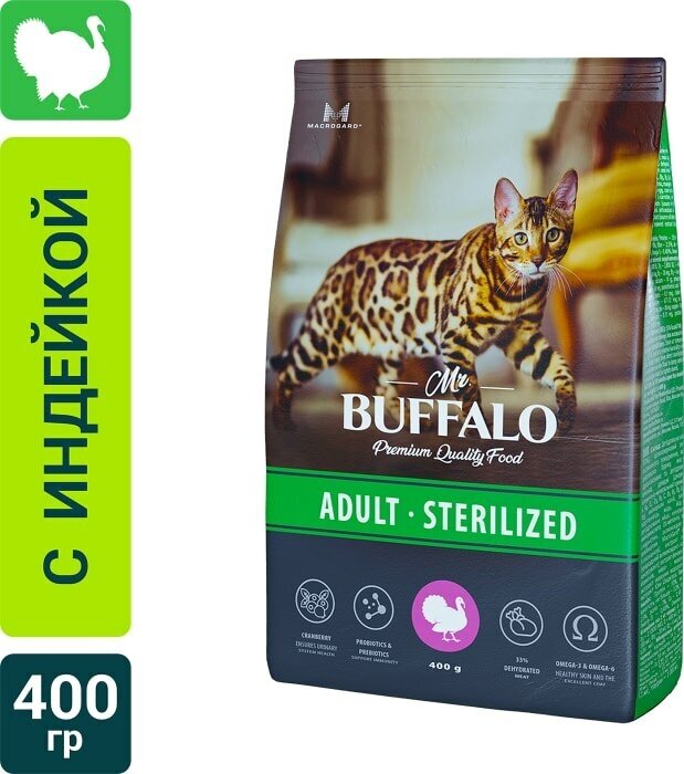 Лучшие цены. Полнорационный сухой корм Mr. Buffalo STERILIZED с индейкой разработан с учетом потребностей стерилизованных кошек и кастрированных котов, включает все необходимые питательные вещества для поддержания жизненных сил, здоровья мочевыделительной системы, поддержанию оптимального веса и мышечной массы питомца. Корм содержит ненасыщенные жирные кислоты Омега-3 и Омега-6, обеспечивающие иммунитет, здоровую кожу и отличную шерсть. Магазины в вашем городе.