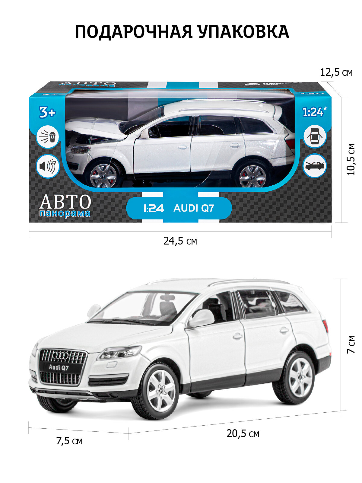 Модель машины Автопанорама 1:24 Audi Q7, белый, свободный ход колес, открываются двери, капот, багажник, свет, звук (JB1200118)