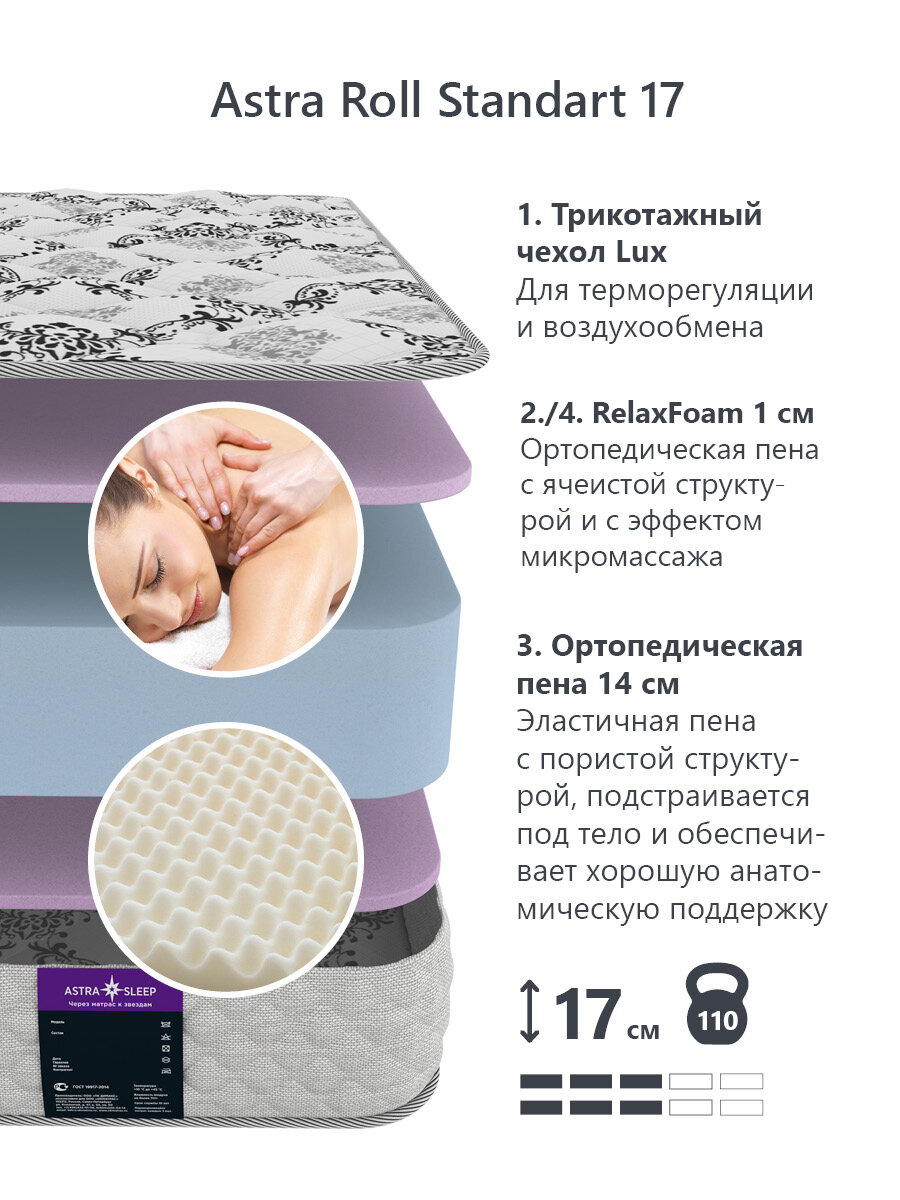 Лучшие цены. Беспружинный матрас Astra Sleep Roll Standart 17 для кровати размером 180х195 см или 1800х1950 мм. Рекомендуем использовать защитный наматрасник Astra Sleep Guard или непромокаемый чехол Astra Sleep Water Shield для увеличения срока службы матраса и предотвращения загрязнений. Особенности матраса: Ортопедическая пена. Универсальный гипоаллергенный наполнитель, хорошо держит форму и способствует естественному положению тела. Магазины в вашем городе.