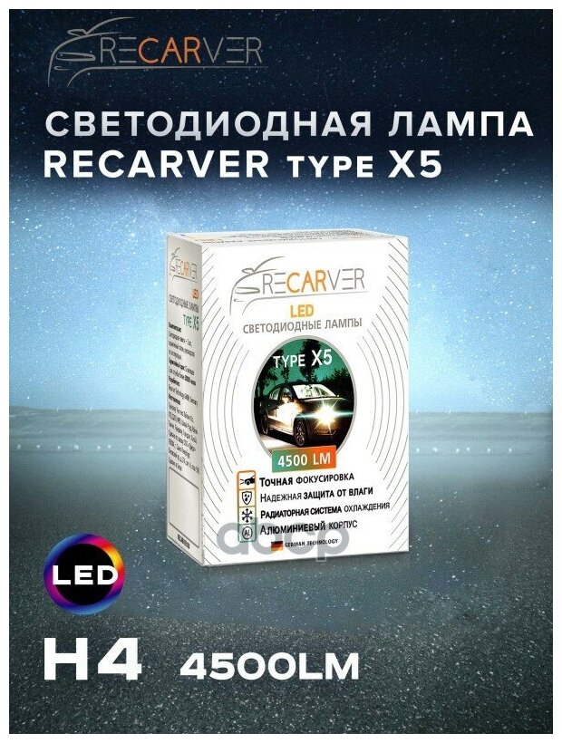 Автолампы Комплект ламп led recarver type x5 h4 4500 lm (2шт) 6000k, RECARVER RTX5LED70H42 (1 шт.)