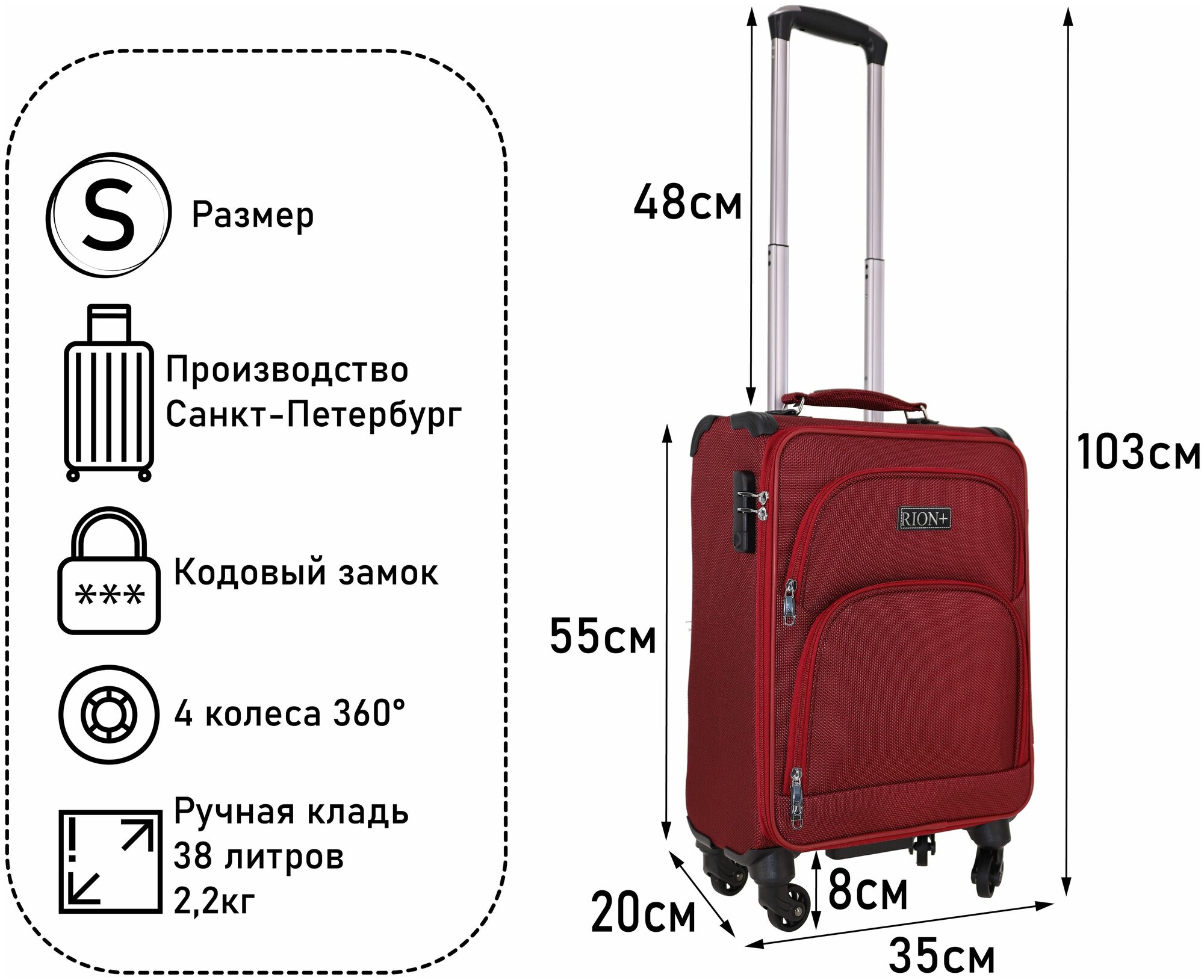 Чемодан Рион+ (RION+) R453, Ткань, 55 см, 38 литра, 4 колеса, S (до 55 см), ручная кладь, супер-легкий, 2,4кг, бордовый