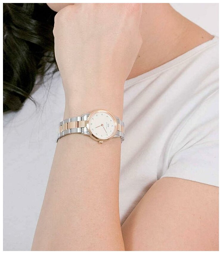 Лучшие цены. Женские кварцевые часы. Центральные часовая и минутная стрелки. Белый циферблат украшен кристаллами Swarovski в местах часовых меток. Круглый корпус выполнен из нержавеющей стали с частичным IP покрытием цвета розового золота. Диаметр корпуса составляет 28 мм, толщина 8 мм. Стальной звеньевой браслет шириной 14 мм с частичным покрытием, раскладывающаяся застежка. Прочное минеральное стекло устойчивое к мелким механическим повреждениям. Водостойкость WR 30 (брызги). Магазины в вашем городе.