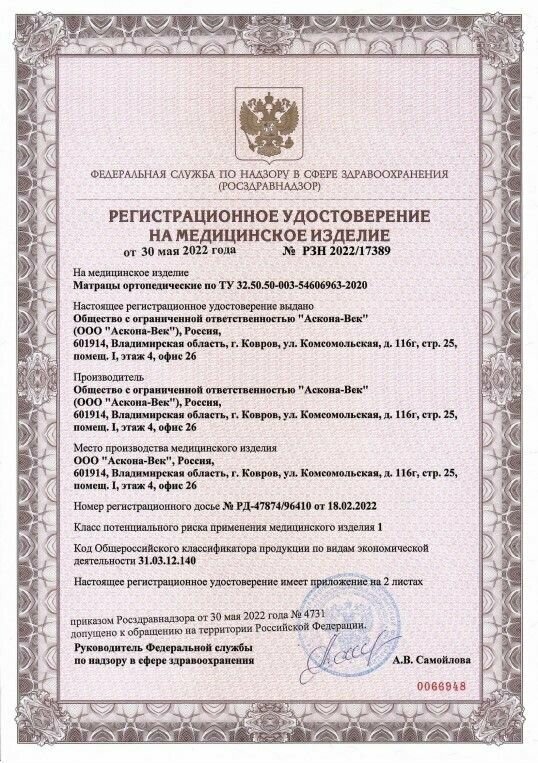 Лучшие цены. Матрац ортопедический артикул ORT-M-02-04 Ортопедические матрасы Askona Ortho разработаны совместно с врачами, а также специалистами в области ортопедии, физиотерапии, хирургии и мануальной терапии. Терапевтическая эффективность подтверждена клиническими испытаниями в ведущих медицинских учреждениях страны. Все матрасы Askona Ortho имеют регистрационное удостоверение Росздравнадзора № РЗН 2022/17389 от 30.05.2022, подходят для использования в медицинской реабилитации и восстановления нарушенных. Магазины в вашем городе.