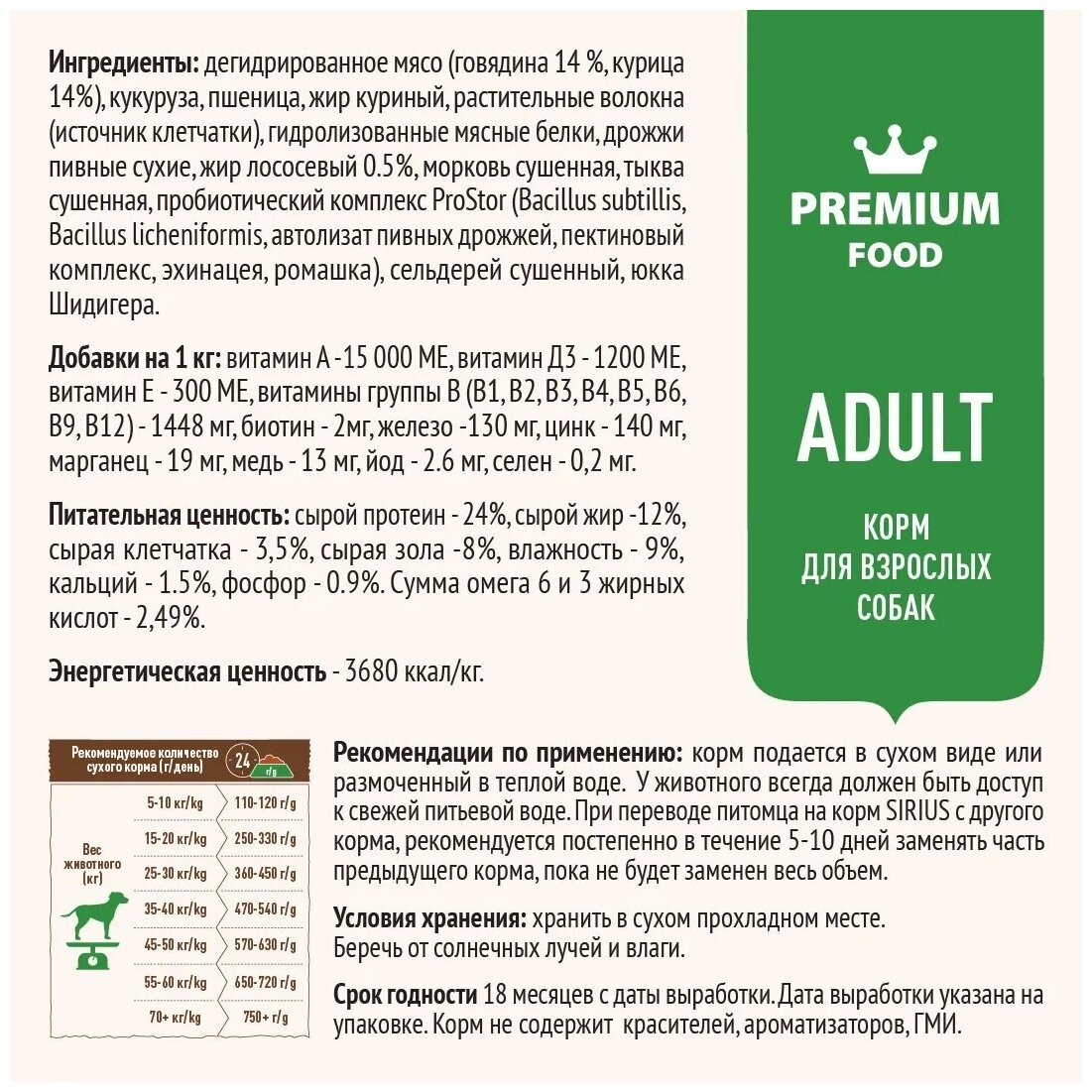 Лучшие цены. SIRIUS - сухой корм премиум класса для полноценного ежедневного рациона взрослых собак. Высокое содержание мясных ингредиентов обеспечивает оптимальный уровень белка и укрепляет мышцы. Баланс витаминов и комплекса пробиотиков 4-го поколения PROSTOR+ нормализует пищеварение и укрепляет иммунитет. Омега 3 и Омега 6 способствуют поддержанию здоровья сердца, мозга, нервной системы, здоровья кожи и красоты шерсти. Магазины в вашем городе.