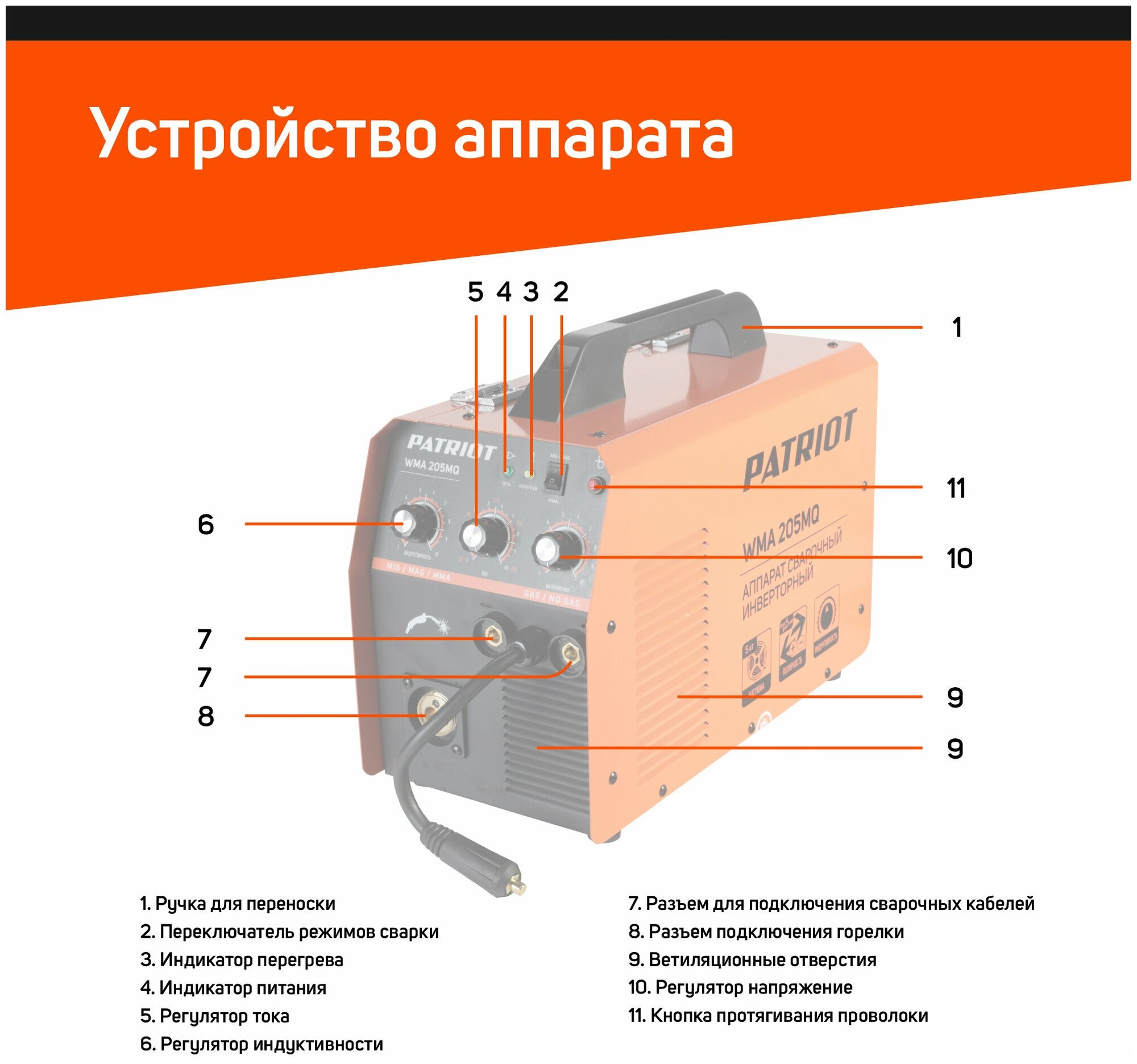 Полуавтомат сварочный инверторный PATRIOT WMA 225MQ MIG/MAG/MMA, полуавтоматическая сварка в среде г