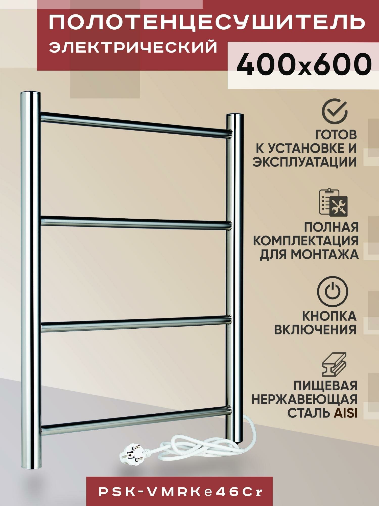 Лучшие цены. Идеальный электрический полотенцесушитель KASKAD PSK-VMRKe46Cr 400х600 мм. с минимальным энергопотреблением и количеством перекладин - 4 штуки. Материал - пищевая нержавеющая сталь AISI. Полотенцесушитель выполнен по техническим условиям производителя (ТУ) из углеродистой стали из труб различного сечения с гибким греющим кабелем. Вертикальные трубы d -32 мм, для горизонтальных вставок используется труба d — 18 мм. Магазины в вашем городе.