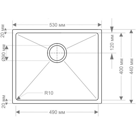 | Размеры врезного отверстия (под столешницу) | 490x400 мм (угловой радиус врезки 10 мм) |