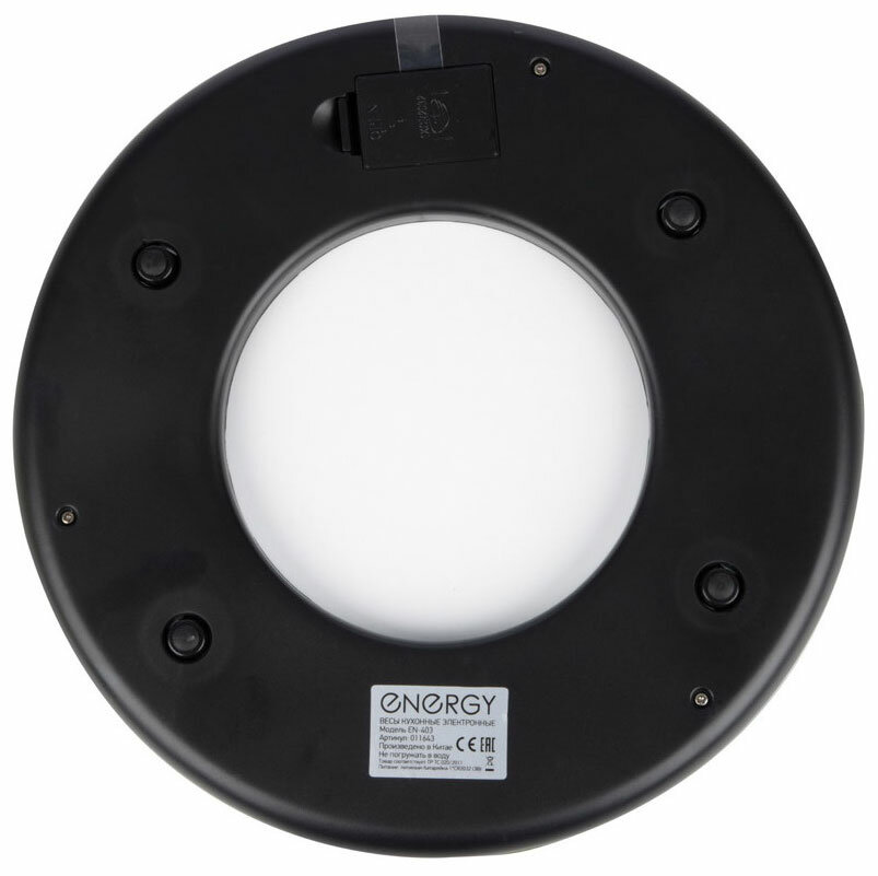 Лучшие цены. Описание: Максимальная нагрузка 5 кг Цена деления 1 грамм Стеклянная поверхность Крупный LСD дисплей Диаметр платформы 20 см Выбор единиц измерения (грамм, мл, унция) Сенсорное управление Функция «Тара» Автоотключение Индикатор перегрузки и заряда батарейки Питание от батарейки: 1*CR2032 (входит в комплект) Особенности: Бренд: ENERGY Гарантия:1 год Единицы измерения: граммы Объем упаковки:0,001433 Страна производства: Китай Тип (Техника для кухни). Магазины в вашем городе.