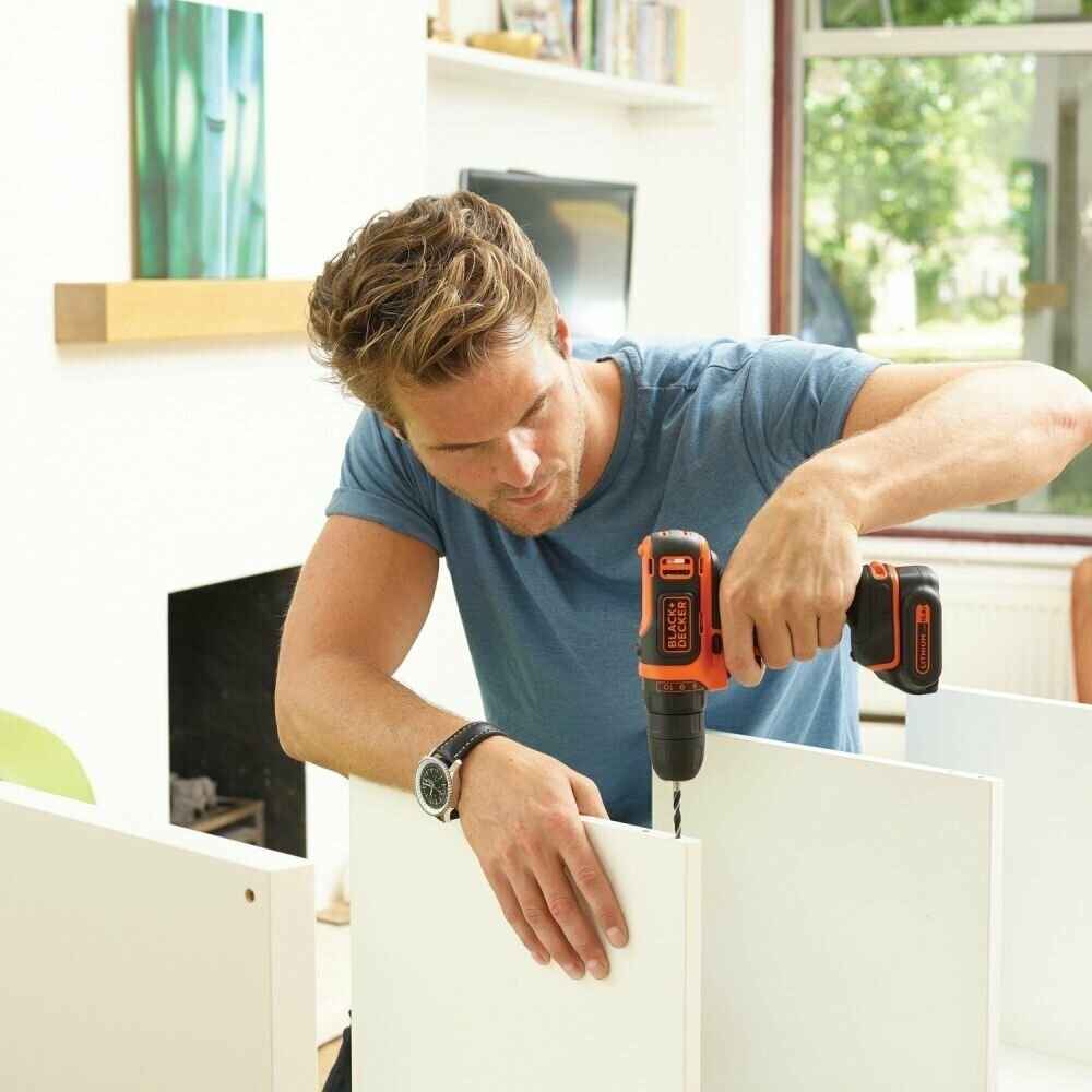 Лучшие цены. 10,8В; Li-Ion;1,5Ач;2акк;26Hm;550 об/мин; БЗП 10мм; доп. рук; вес 1,6 кг Аккумуляторная дрель-шуруповерт BLACK+DECKER BDCDD12B-XK обладает компактными размерами, поэтому удобна для переноски и хранения. Она оборудована светодиодной подсветкой для работы в местах с плохим освещением. Уверенно справляется с широким спектром задач: сверлением отверстий, закручиванием/выворачиванием винтов, шурупов, саморезов (до 6х50 мм). Магазины в вашем городе.