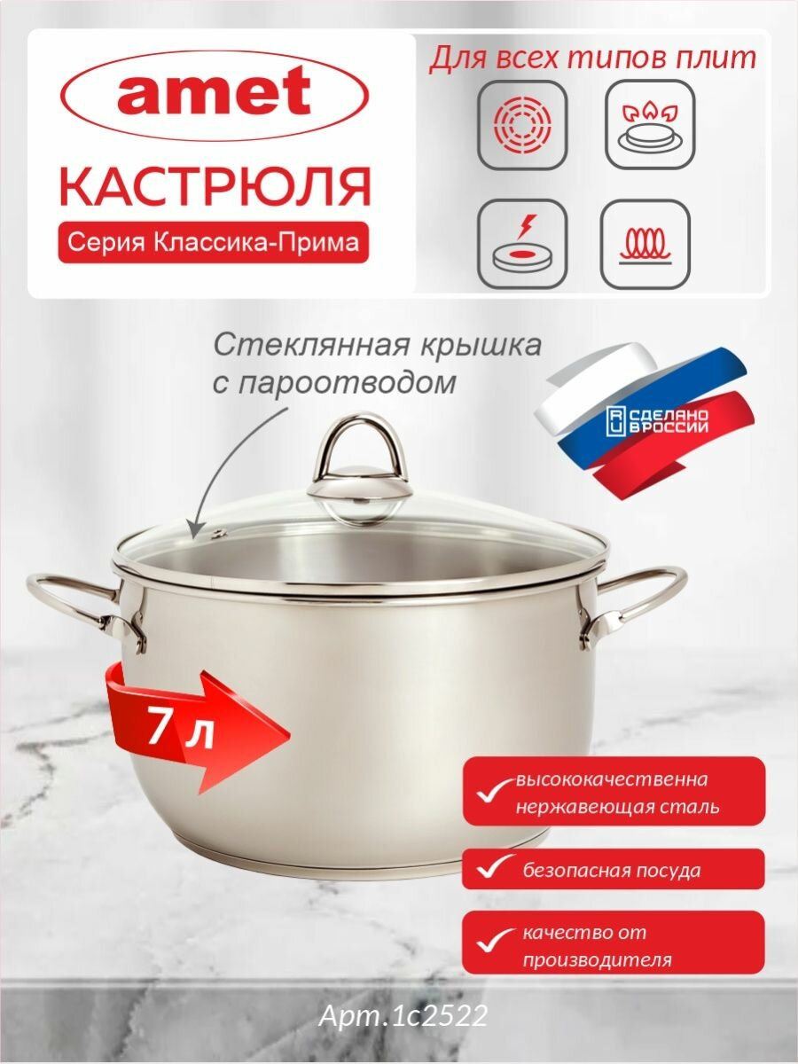 Амет 1с2384 Классика-Прима ТРС-3, Кастрюля с крышкой (объём 8,0 л; нержавеющая сталь, прутковые ручки)
