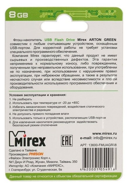 Флешка 8Gb Mirex 8GB Mirex Arton, USB 2.0, Зеленый USB 2.0 зеленый 13600-FMUAGR08