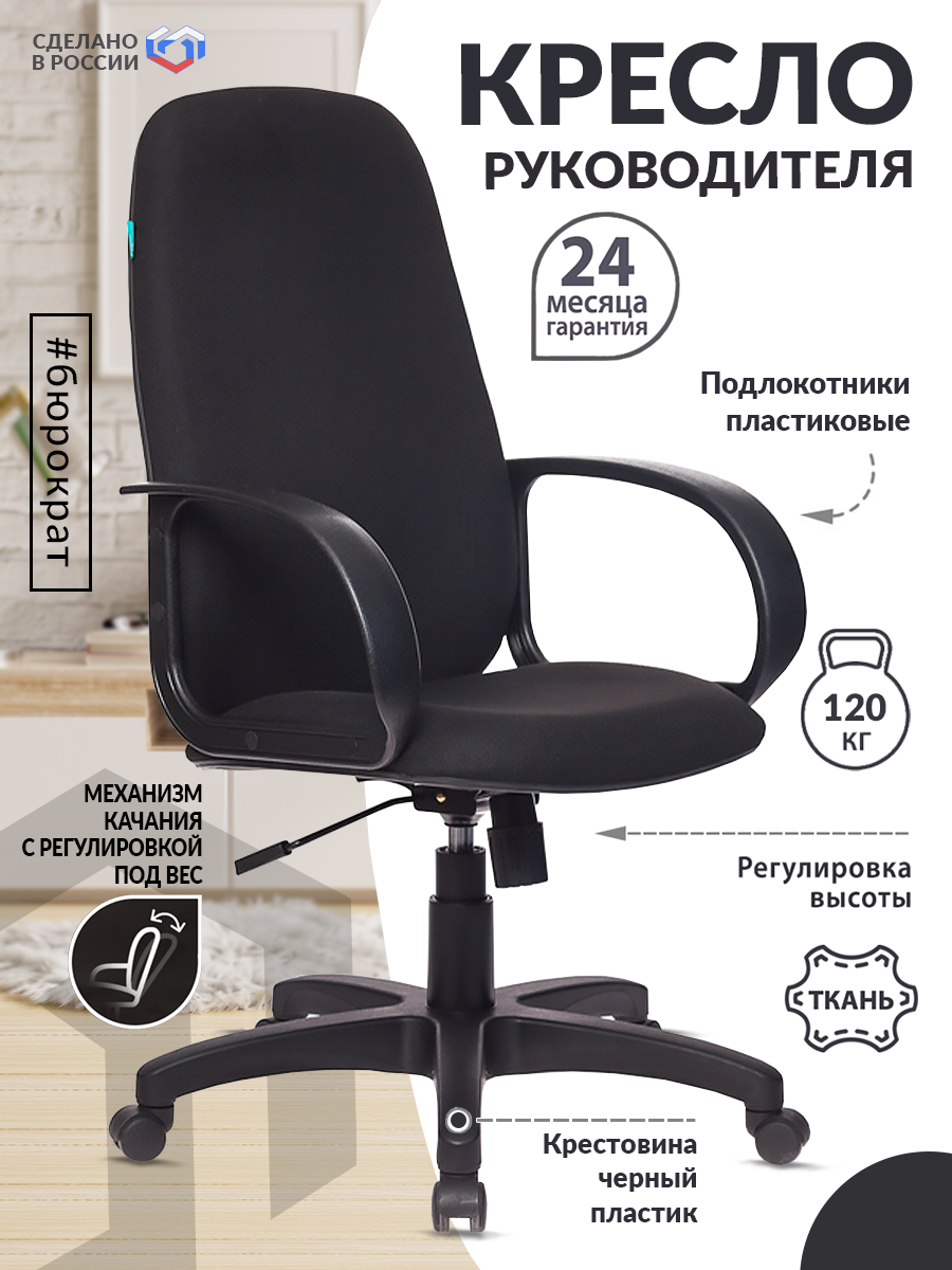 Кресло Бюрократ компьютерное черное, ткань, крестовина пластик - Кресло руководителя, с подлокотниками