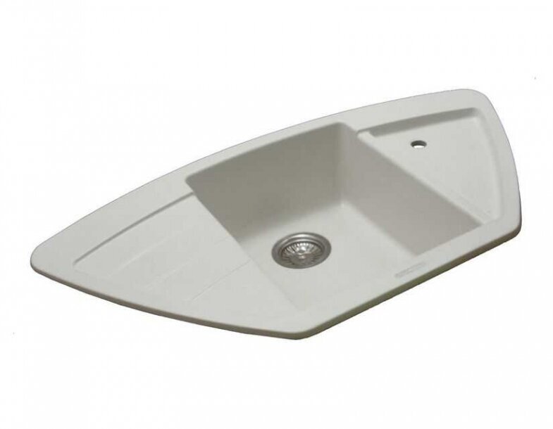 Лучшие цены. Гранитная мойка A.2 - угловая модель с глубиной чаши 180 мм, удобным крылом и вторым крылом с углублением и с интегрированным дополнительным сливом. Возможна установка не только в угловую кухню, но и в прямую столешницу. (Ширина угловой тумбы должна быть не менее 900 х 900 мм! ) Имеется два отверстия под смеситель слева и справа.Мойка укомплектована сливной арматурой. Магазины в вашем городе.