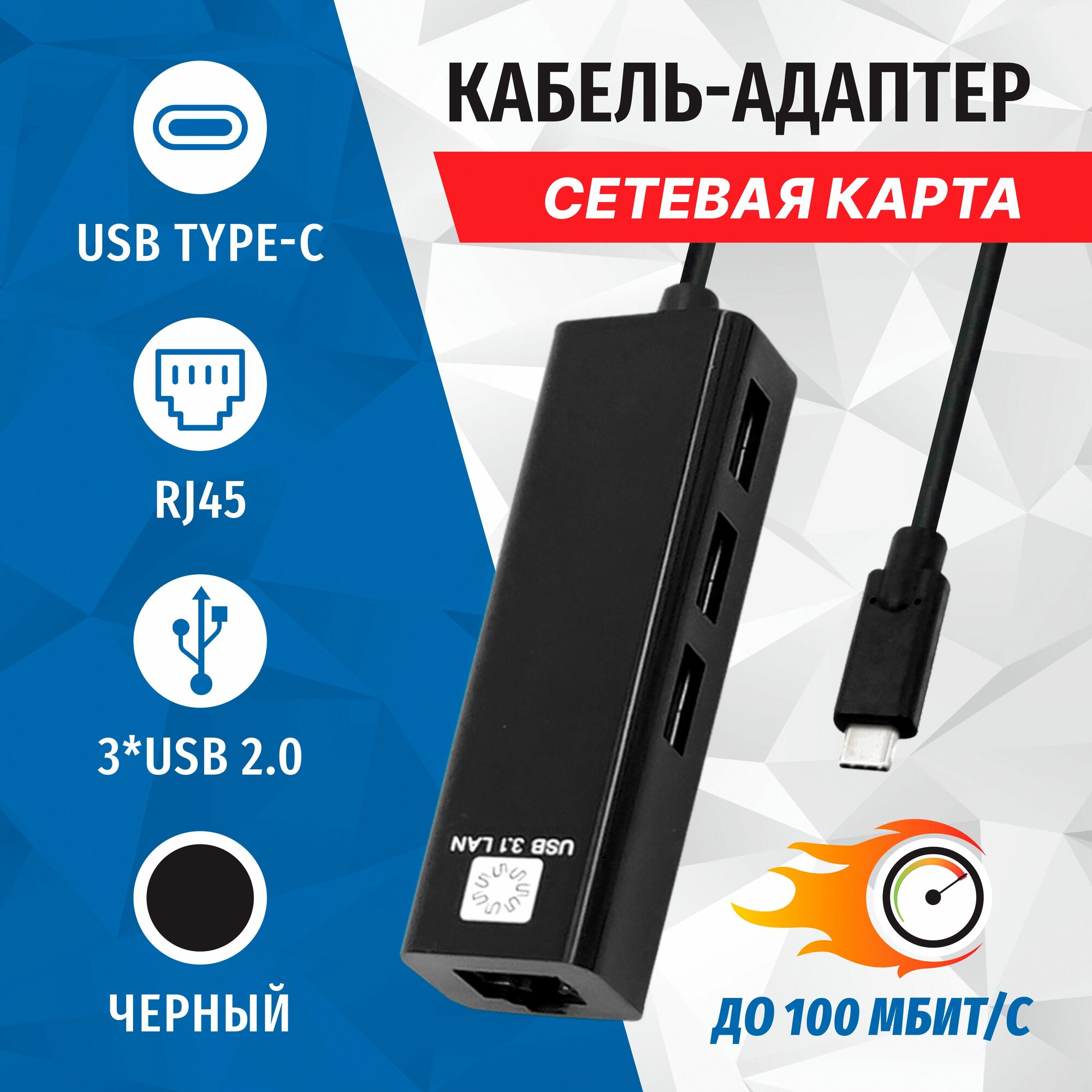 Сетевая карта USB3.1, RJ45 100 мегабит, 3-х портовый USB2.0 разветвитель, 5bites UA3C-45-09BK