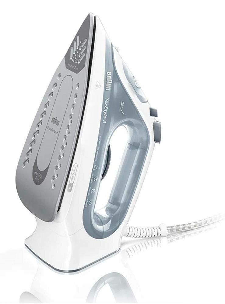Лучшие цены. Утюг Braun TexStyle3 SI3054GY серый, мощность 2400Вт, подошва утюга FreeGlide 3D, паровой удар 180г, емкость для воды 270мл, длина шнура 2м. Магазины в вашем городе.