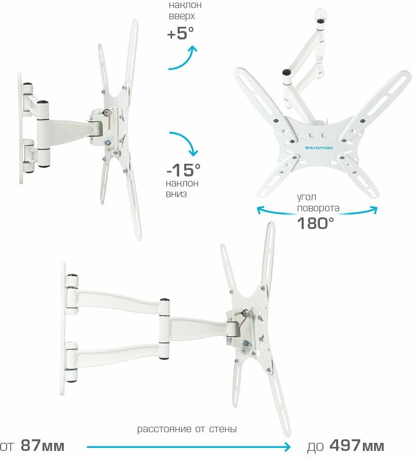 Kromax Крепеж TECHNO-5 white, Кр. алюм. наст. для TV 15"-55", max 35 кг, 5 ст св., нак. 15 , пов. 180 , от ст. 87-497 мм, max VESA 400x400 мм.