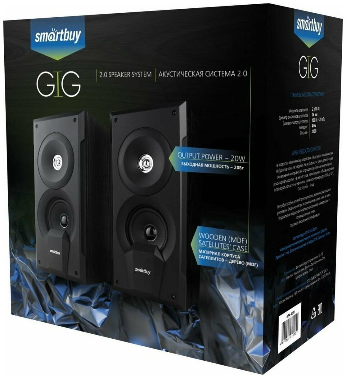 Лучшие цены. Акустическая система SmartBuy GIG, 2.0, SBA-4200, 20 Вт, МДФ, черная 1 шт. Колонки Smartbuy Gig (SBA-4200) являются рациональным решением при выборе акустической системы. Устройство обеспечивает чистое реалистичное звуковое сопровождение при просмотре фильма, сериала и прослушивании музыкальных композиций в домашних условиях, поскольку обладает мощными динамиками (20 Вт). Магазины в вашем городе.