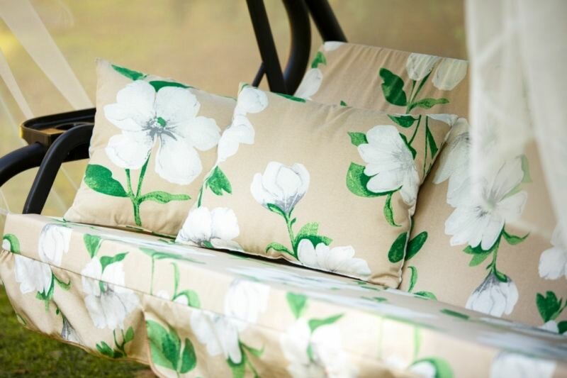 Садовая качель Качели садовые 3-х местные Мебельторг Турин Каркас черный/Бежевый, белый рис.цветы