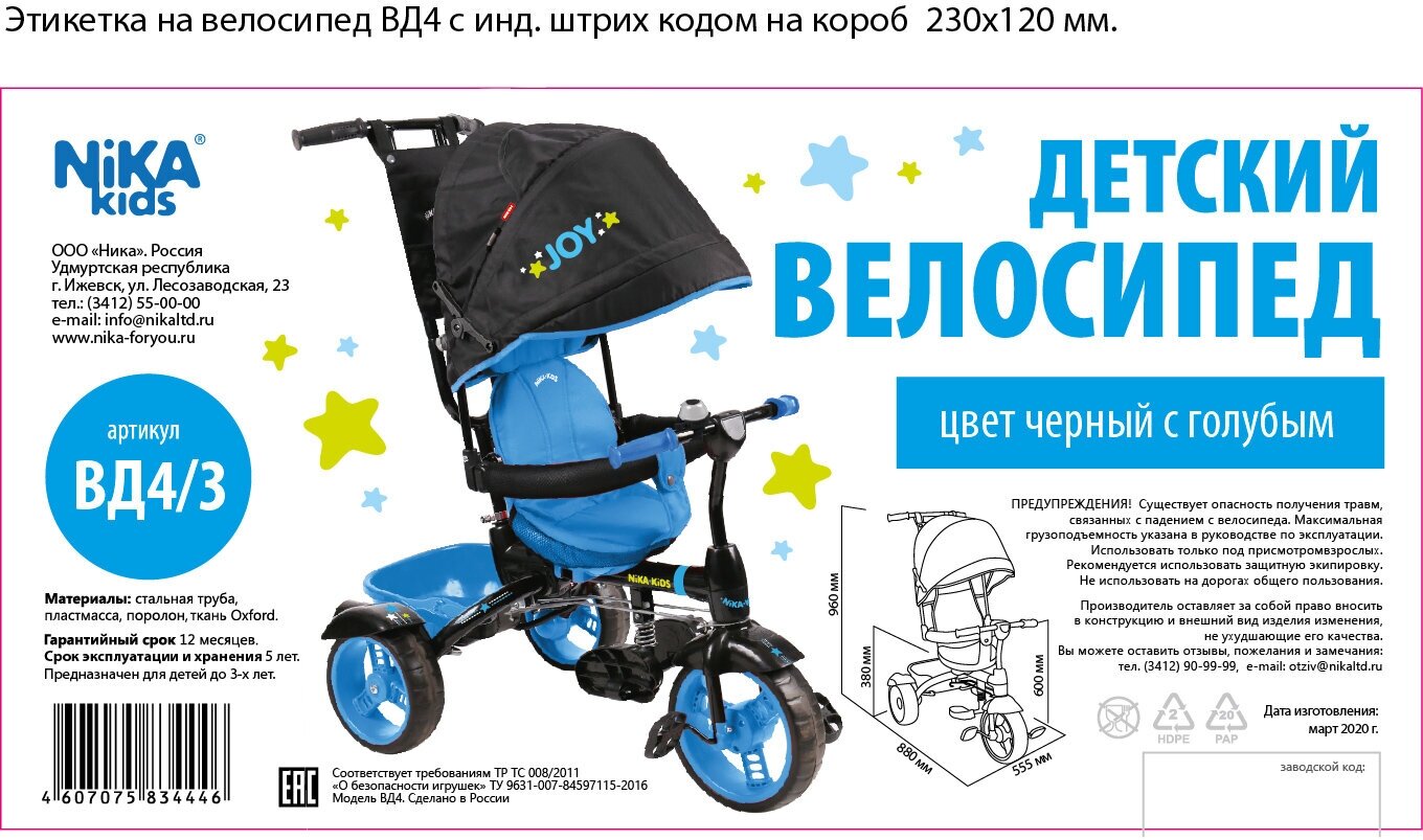 Велосипед трехколесный детский Nika ВД4, черный, голубой