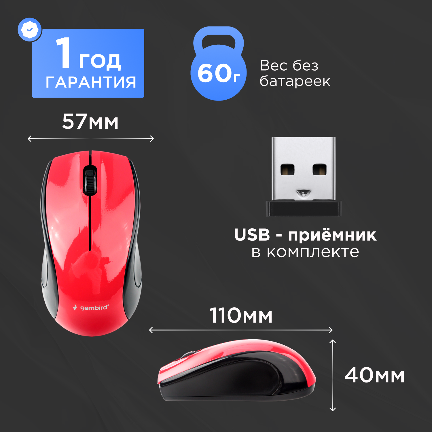 Мышь беспроводная Gembird MUSW-320-R, 2.4ГГц, красный, 2 кнопки+колесо-кнопка, 1000 DPI, батарейки в комплекте, блистер 850 ₽ Подробнее