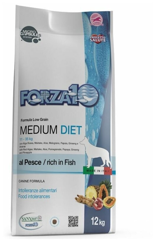 Корм Forza10 Diet Medium (гипоаллергенный) для собак средних пород при пищевой аллергии, с рыбой (с микрокапсулами), 12 кг