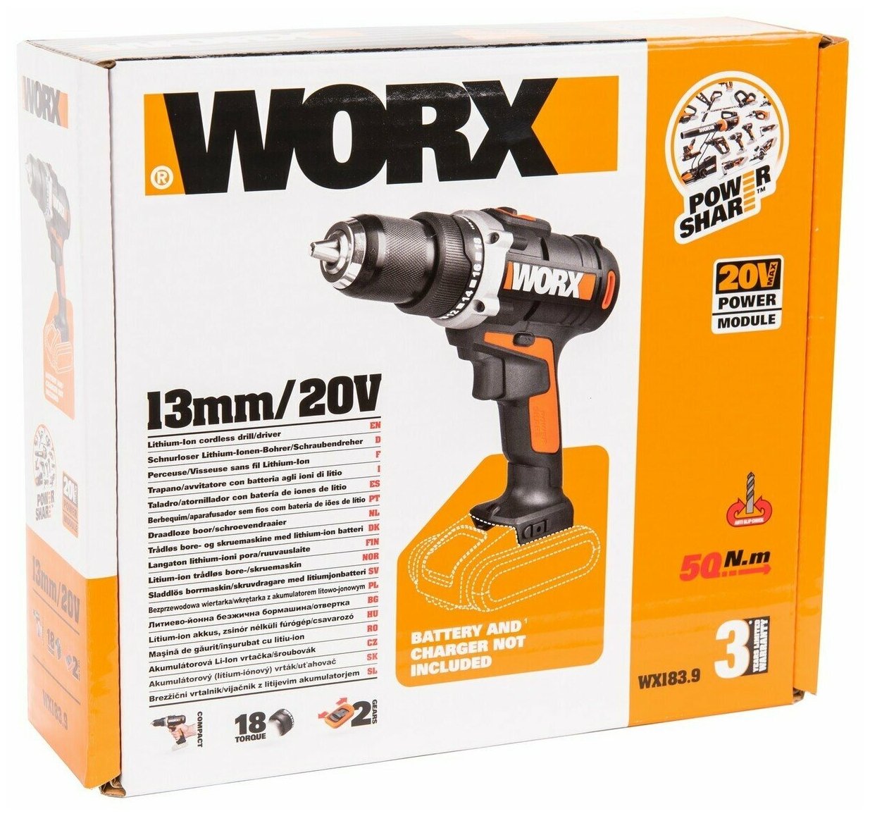 Дрель/шуруповерт Дрель-шуруповерт аккумуляторная Worx WX183.9, 50 Нм, 20 В, без АКБ и ЗУ, коробка